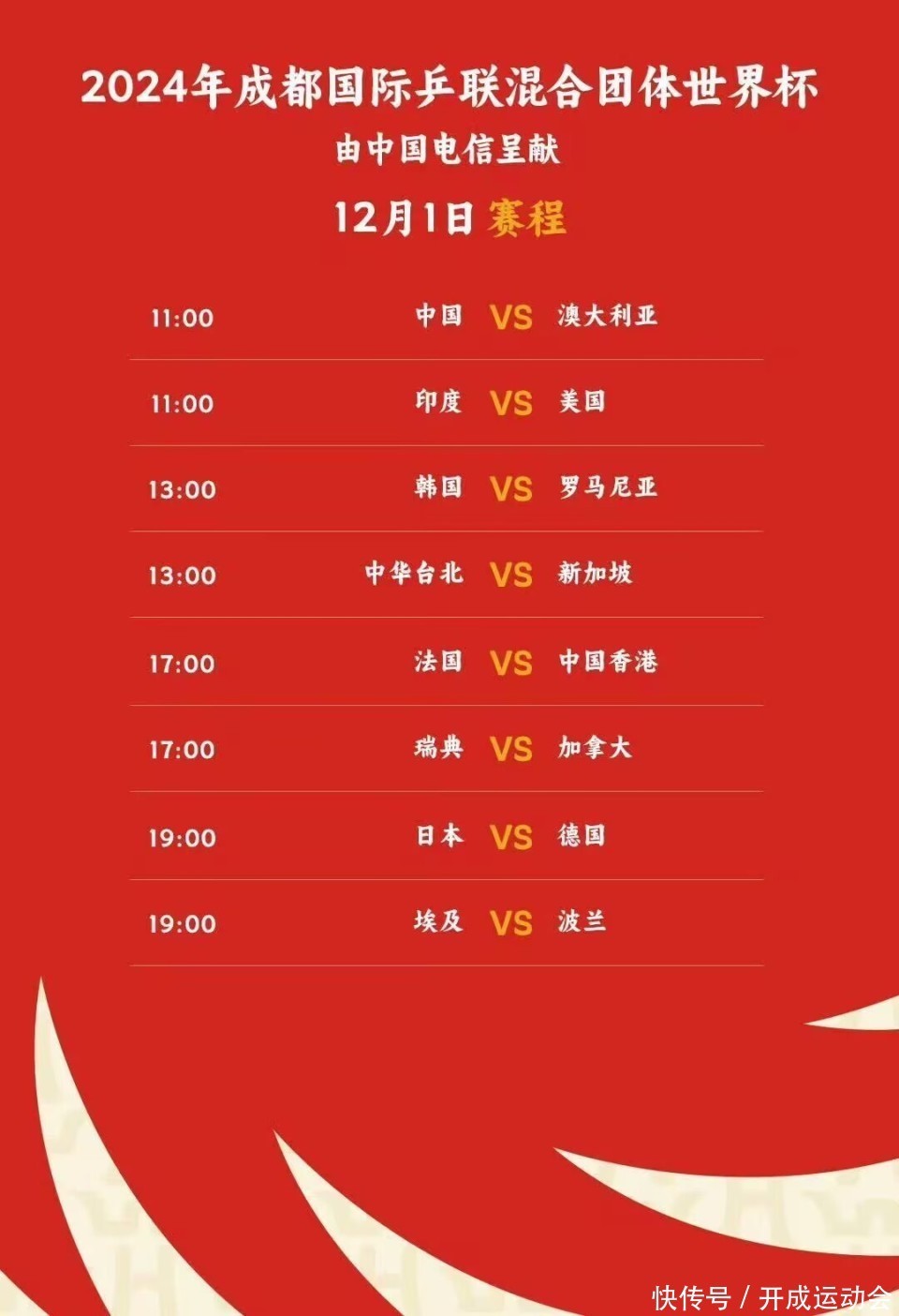 国乒具体赛程为:12月1日11:00,国乒VS澳大利亚队,央视CCTV5选拔性直播,咪咕体育付费直播!