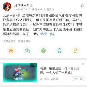 2011年足协条款里面怒放微博,戚军即是那时期入驻的,那时他郑重竞赛部职责,因为更新极度频频,何况输出的个东说念主不雅点许多,亦然焦点东说念主物。